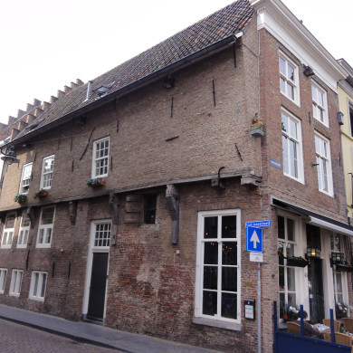 Het Keershuis. Laatgotisch huis. Zijgevel aan de St. Janstraat met overgekraagde verdieping en achtergevel met oorspronkelijk zadeldakvormig afgedekte trappen.