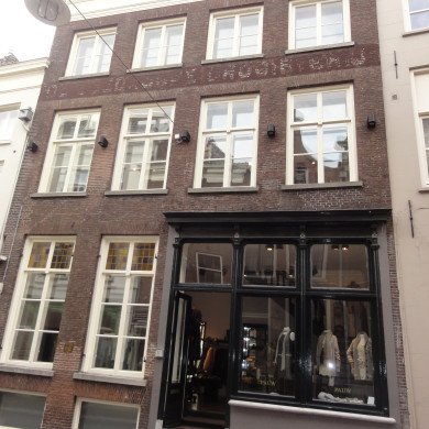In oorsprong vermoedelijk 17e eeuws, gedeeltelijk onderkelderd pand met twee verdiepingen onder met pannen gedekt zadeldak (dwarskap) tussen tuitgevels met vlechtingen. De voorgevel (XIX B) is opgetrokken in schoon metselwerk, vier vensterassen breed en afgesloten met forse, geprofileerde kroonlijst; op de begane grond twee 8-ruits schuiframen, daaronder twee kelderluiken, en een vrijwel gave, houten, 19e eeuwse winkelpui; op de 1e verdieping 6-ruits schuiframen; op de 2e verdieping 4-ruits draairamen.