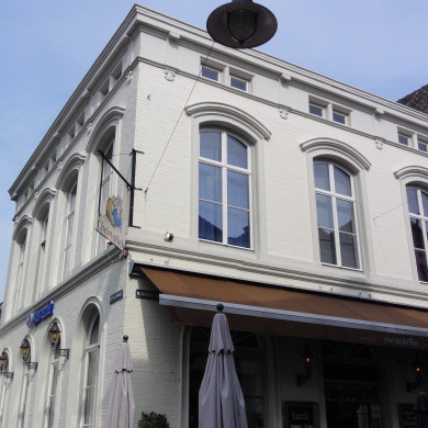 16e eeuws pand met twee verdiepingen onder met pannen gedekt zadeldak met schild (voor) en tegen trapgevel (achter); in 1913 sterk verbouwd, waarbij de hoek werd afgeschuind en voorzien van een iets uitkragend topgeveltje onder insteekkap, de gevels werden voorzien van getoogde vensters met T-ram