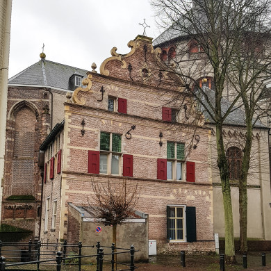 Kosterij der Kruiskerk uit 1619. Gevel met voluutvormige trappen.
