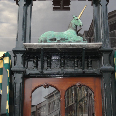 Huis met lijstgevel uit het begin der 19e eeuw. Winkelpui met beeld van eenhoorn voor bovenlicht. 19e eeuws winkelinterieur, kasten; achterwand met glasroeden in siervormen.