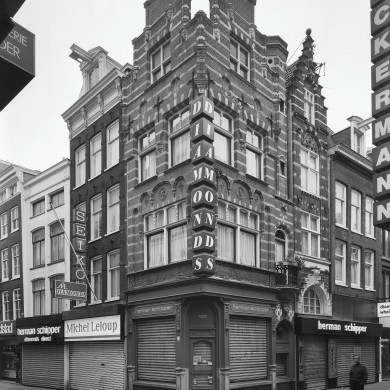 Aardig gecomponeerd hoekpand (1891, door G. van Arkel) in neo-gotische en renaissance vormen, met twee trapgevels, een gebeeldhouwd fries en een torentje.