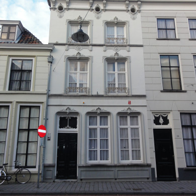 De wit gepleisterde voorgevel (XIXc) heeft een grijs geverfde plint met lijstwerk, cordonlijsten en is afgesloten met een geprofileerde kroonlijst voorzien van drie paar consoles, waartussen een met stucwerk decoraties omlijste oculus; paneeldeur met naald en bovenlicht met levensboom en twee vensters met 8-ruits draairamen op de begane grond, twee vensters met 6-ruits draairamen en gietijzeren raamhek op de verdieping en twee vensters met 4-ruits draairamen en gietijzeren raamhek op de tweede verdieping, alle voorzien van geprofileerde stucwerkomlijsting met kuif.