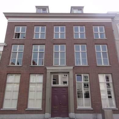 In oorsprong vermoedelijk 17e eeuws pand met verdieping onder met blauwe Hollandse pannen gedekt zadeldak met wolfeind (voor) en tegen gepleisterde tuitgevel (achter); aan de oostzijde een gang naar voorheen achter het pand gelegen woningen.