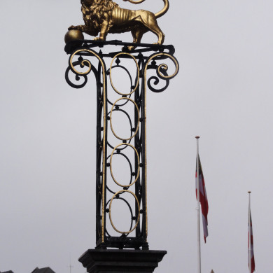 Een, voor het pand Schapenmarkt 4 geplaatste 18e eeuwse kolom met daarop zich bevindende vergulde gebeeldhouwde leeuw.