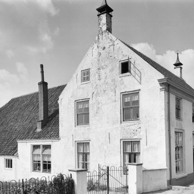 Gepleisterd DWARSHUIS, waarschijnlijk 18e eeuw, met lage verdieping en zadeldak, waaruit met windkappen bekroonde hoekschoorstenen oprijzen.