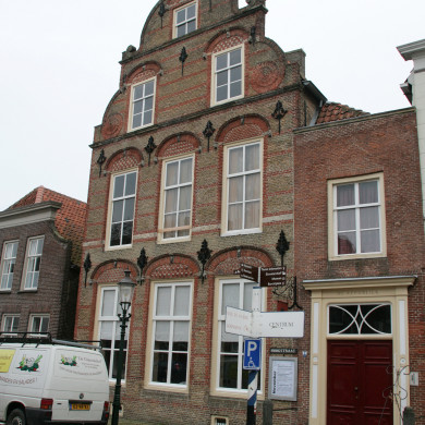Vroeg XVIIe eeuws huis met rijkversierde gevel van rode en gele baksteen; de top begrensd door uitgezwenkte rollagen, afgewisseld met pilasters, de onderste uitzwenking uitlopend in een binnenwaartse voluut. Boven de vensters geprofileerde, korfboogvormige tooglijsten, in de boogvelden metselmozaieken. Natuurstenen waterlijsten. Dertien krulankers. De ingang bevindt zich in een toegevoegd, vroeg XIXe eeuwse zijbouw, ingangsomlijsting in empire stijl evenals de deur. Inwendig stucplafonds en zwaar beschadigde wandbeschilderingen en een schouw van omstreeks 1780-1800.