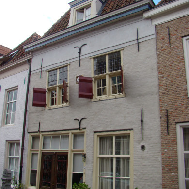 HUIS met gevel van het "Dordtse" type zonder top, uit begin XVIIe eeuw. Uitgemetselde verdieping op gebeeldhouwde kopjes, lelie-punten in de driepasversiering der boogvelden boven de vensters, waarboven uitgekraagde korfboogvormige tooglijsten. Waterlijst van streks gemetselde bakstenen.