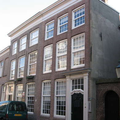 Pakhuis (XIX). Fraaie gevel met diep terugliggende vensters en deuren vlak in de gevel.