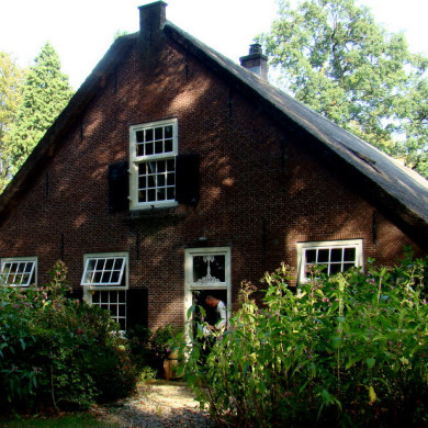 Fraaie 18e eeuwse boerderij met rieten bedaking, oude roedenverdeling. Vensters en halve luiken.