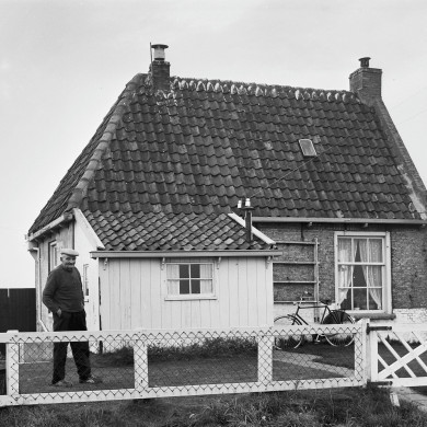 Woonhuis onder met blauwe golfjes pannen gedekt schilddak.