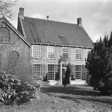 BOERDERIJ van het langstraatse type met dwarshuis, begin 19e eeuw. Zadeldak tussen puntgevels. Vensters met luiken, deuromlijsting met consoles, houten kroonlijst. Zes stoeppalen van hardsteen en kettingen. Rechts een grote grote schuur van gepotdekselde houten delen met rieten wolfdak.