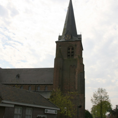 Toren van de R.K. Kerk met overhoekse steunberen aan de westzijde. Veelhoekige traptoren aan de noordoostzijde. Mechanisch torenuurwerk, firma Kerkhof en Zn., 1909, buiten gebruik gesteld.