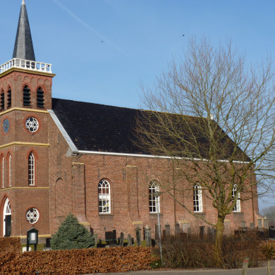 Herv.Kerk op Kerkhof. Driezijdig gesloten zaalgebouw uit 1773 met ingezwenkte steunberen langs de muren.