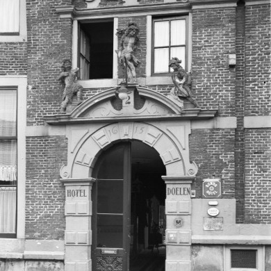 Doelengebouw. Pand bestaande uit drie onderdelen van links naar rechts: pilastergevel uit 1648 waarvan de top verloren is gegaan, Hendrick de Keysergevel uit 1615 met gekoppelde pilasters en rolwerkornament in de boogtrommels, waarvan eveneens de top verloren is en breed laat 18e eeuws deel (1778). In het midden natuurstenen poortje met twee vrijstaande beelden door Jer.Sutel, 1615. Inwendig grote zaal met balkzoldering op gesneden consoles (1648). In middendeel oude indeling grotendeels behouden.