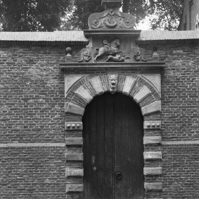Twee poortjes van het Doelenveld in moderne muur naast schoolgebouw. Met blokken omlijste poortjes waarboven natuurstenen toppen met voorstelling van St.Joris en St.Sebastiaan. (Toppen verwisseld in 1910).