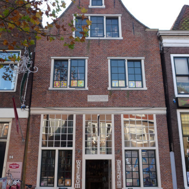 Huis met laat 17e eeuwse halsgevel; boven gewijzigde pui vensters met 18e eeuwse roeden.