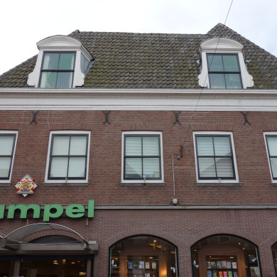 Zes traveeën breed laat 18e eeuws PAND met rechte kroonlijst en twee dakkapellen voor drie oudere panden waarvan een de top behouden heeft. Pui modern.