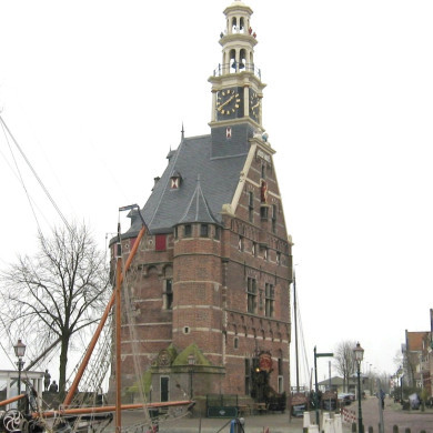 Hoofdtoren. Halfronde bakstenen toren met Ledesteen bekleed, hoofdzakelijk uit 1532; aan de landzijde een topgevel in 1651 gewijzigd, toen de klokkentoren verrees. Klokkenstoel met gelui bestaande uit een klok van François en Pieter Hemony, 1646, diam. 106,5, een klok van een anonieme gieter, 1529, diam. 52 cm en een moderne klok.
