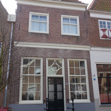 17e eeuws pand met verdieping en houten kroonlijst. Schilddak. Gepleisterde onderpui van vroeg 19e eeuws karakter. In de verdieping twee 17e eeuwse kruiskozijnen, die een hijsluik met authentieke strokendeuren flankeren.