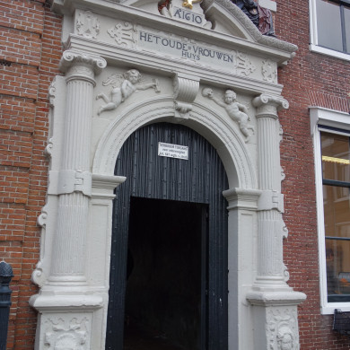 Oude Vrouwenpoortje. Gebeeldhouwd natuurstenen poortje, overblijfsel van het Oude Vrouwenhuis, thans alleen toegang gevend tot een overbouwde gang met tongewelf gedekt een aan de achterzijde bekroond door een bakstenen topgevel boven natuurstenen geprofileerde omlijsting. Poortje in Hendrick de Keyser-trant, 1610, wellicht eigenhandig.