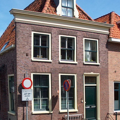 Hoekpand, oorspronkelijk 17e eeuws pand onder hoog zadeldak, gevel met rechte kroonlijst, XIX.