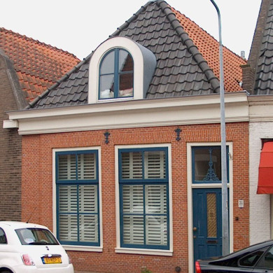 Pand zonder verdieping onder schilddak. Boven de kroonlijst halfronde dakkapel. Zesruitsvensters.