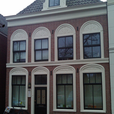 Pand met verdieping en schilddak, wellicht 17e eeuw. Gepleisterde voorgevel met in de parterre getoogde deur en vensters tussen muurdammen en in de verdieping vensters met vierruitsschuiframen. Houten kroonlijst en dakkapel. De gevel dateert in de huidige staat uit het midden van de 19e eeuw.