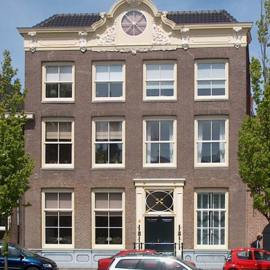 Vier traveeën breed pand met twee verdiepingen, bekroond door verhoogde gootlijst met rococo-snijwerk, XVIII b. Pui garage. Inwendig betimmering en schouw van stucwerk.