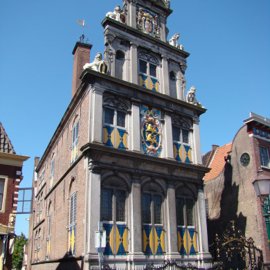 Huis met monumentale bakstenen gevel van vijf traveeën, afgesloten door klassiek hoofdgestel met metopen en triglyphen, 1790; opzetstuk met wapen van Westfriesland. In middenrisaliet vensteromlijstingen en festoen. Vensters op de verdiepingen met oude roedenindeling.