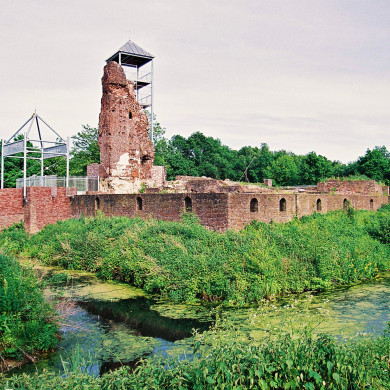 Overblijfselen van het kasteel van Horst. Restanten van het hoofdgebouw omgeven door ten dele gedempte omgrachting. Restant van een bakstenen muur met geprofileerde rondbogige poortomlijsting van natuursteen, XVI, en een schietgat afgezet met natuursteen.