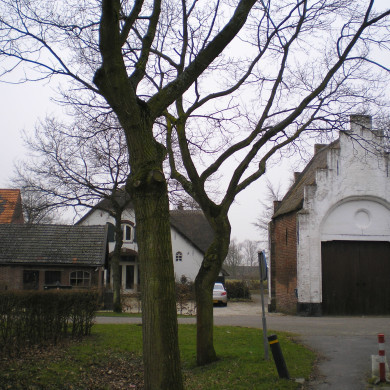 Stenen POORT XVI met trapgevels en rieten dak. Boerderij, dwarshuis, afgewolfde zijgevels en bakhuis.