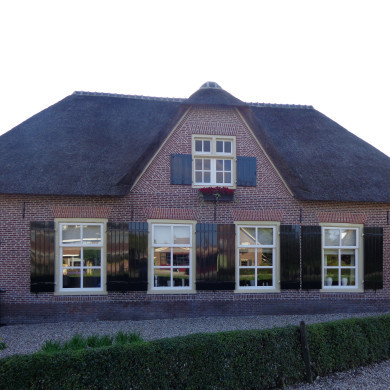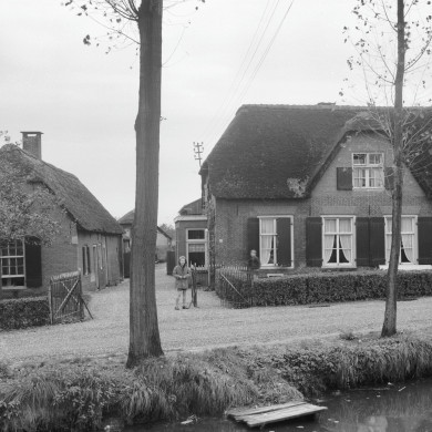 Boerderij van het voerdeeltype, XVIII. Gepleisterd bakstenen gebouw met blokverdeling in de voorgevel, onder afgewolfd rieten zadeldak met nokpannen en een uitbouw onder rieten zadeldak aansluitend tegen de rechter zijgevel. Zesruitsschuiframen, deur links, kelder met opkamer rechts.