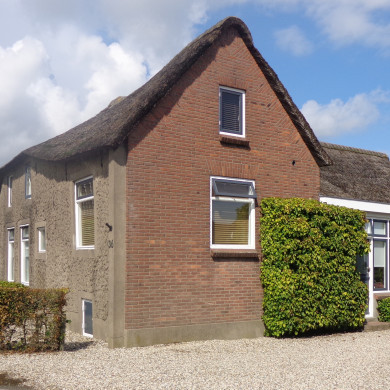 Boerderij, witgepleisterd dwarshuis met rieten afgewolfd zadeldak, kleine roedenverdeling, schuiframen.