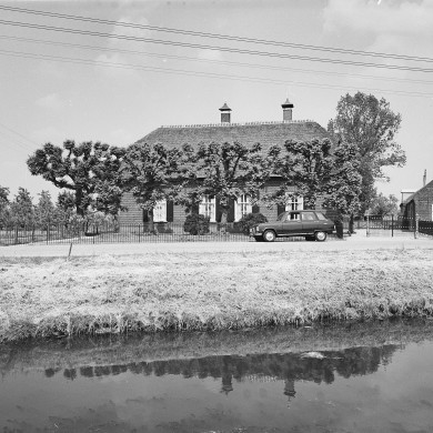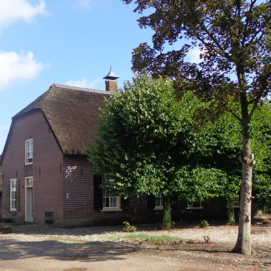 Boerderij, witgepleisterd dwarshuis met rieten afgewolfd zadeldak, kleine roedenverdeling, schuiframen.