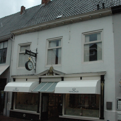 Zeer fraai pand met lijstgevel, met op de hoek een erker en daarnaast een voordeur met bovenlicht en paneelposten.