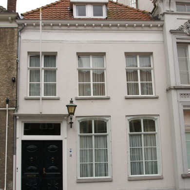 PAND met rechte gepleisterde gevel. Begane grond 8-ruits vensters met XVIII raamkozijnen en alsmede XIX voordeuromlijsting met consoles. Verdieping 6-ruits vensters met hardstenen onderdorpels.