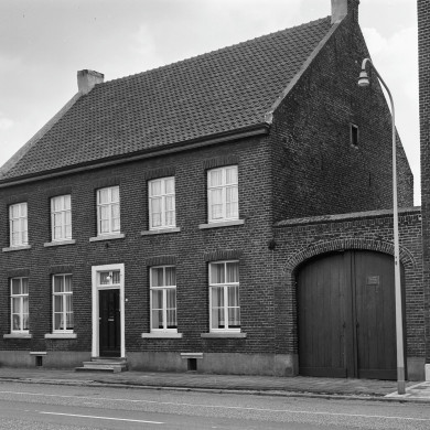 Huis met verdieping onder een zadeldak evenwijdig aan de straat tussen twee koetspoorten.