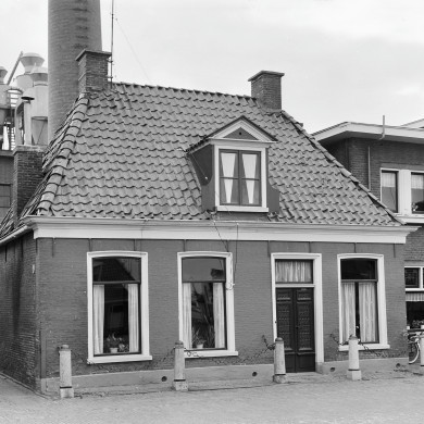 Eenvoudig pand onder zadeldak tegen puntgevel aan de straatzijde. De gevel heeft vlechtingen langs de zijden en daklijsten aanvangend op aanzetlijsten. In de top twee zesruitsvensters; ster-vormig bovenlicht boven de deur. Vier stoeppalen door kettingen verbonden.