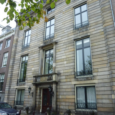 Pand met vier vensters brede gevel (1687/88) onder rechte lijst waarop twee dakkapellen (negentiende eeuw). Dubbele geslaagde stoep met vier bladbalusters. Deurkozijn (eerste kwart achttiende eeuw?), Deur en snijraam (eerste helft negentiende eeuw), snijraamhek (eerste helft achttiende eeuw).