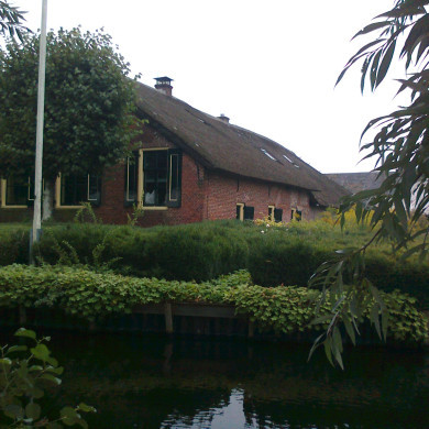 "De Zomer", boerderij, gepleisterd, dwarshuis, in midden afgewolfde gevel, rieten dakbedekking, fraai, waarschijnlijk 17e eeuw.