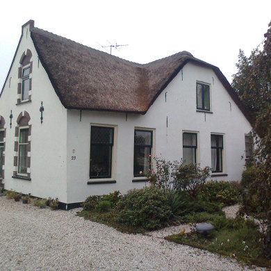 "De Zomer", boerderij, gepleisterd, dwarshuis, in midden afgewolfde gevel, rieten dakbedekking, fraai, waarschijnlijk 17e eeuw.