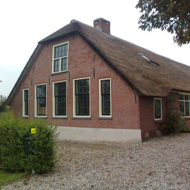 Boerderij, langhuis Ao 1814, vensters met kleine roeden, rieten dakbedekking.