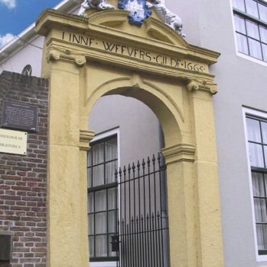 Fors pand onder zadeldak tussen topgevels, inpandig gelegen. De smalle gevel aan de noordzijde heeft bakstenen tandlijsten, moeten en ontlastingsbogen van vroeger, smalle vensters en vlechtingen. XVI. Gebeeldhouwde boogpoort in een omlijsting gevormd door Ionische pilasters met hoofdgestel, bekroond door een gebogen fronton met op de zijden twee leeuwen, die het gekroonde stadswapen ophouden. In het fries: linne weeversgilde 1665.