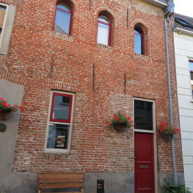 Laag pand onder zadeldak met links een wolfeind. In de huidige vorm een rechthoekig gevelvlak met goot op klosjes; onregelmatig geplaatste vensters, die van de begane grond met roedenverdeling behalve het rechtse gekoppelde venster. Overblijfsel van het Soete Naem Jesus huys, gesticht in 1539.