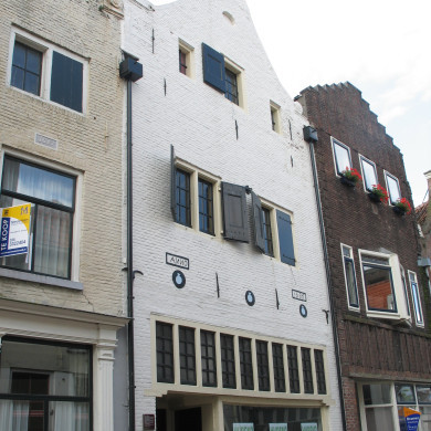 Hoekpand met klokgevel, in jaartalstenen gedateerd ANNO 1687. Op de schouders geprofileerde natuurstenen dekplaten en aanzetvoluten, een driehoekig fronton als bekroning. Zolderluiken en ovaal vlieringlicht, sierankers. Winkelpui XXa. Zijgevel in blokken gepleisterd.