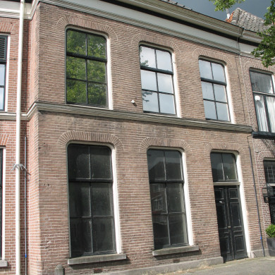 Hoekpand met in blokken gepleisterde lijstgevel op plint. Cordonband. Vensters in empire-trant. XVIII/XIX.