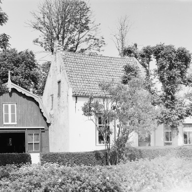 Een 18e eeuwse woning, laag gebouw, dak in topgevels eindigend, waarvan een door wapendragende leeuw bekroond.