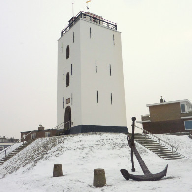 VUURBAAK. Aan Z. zijde van het dorp, bepleistering modern, dateert van 1605.