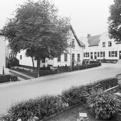 Rechthoekig, aan de uiteinden aan de voorzijde inspringend blok van twee WONINGEN met halve verdieping onder met pannen gedekt schilddak, dat in het midden aan de voor- en achterzijde wat verder doorloopt, en met een decoratie - kegel met bollen en ringen - in tichelwerk op de nokeinden; aan de v